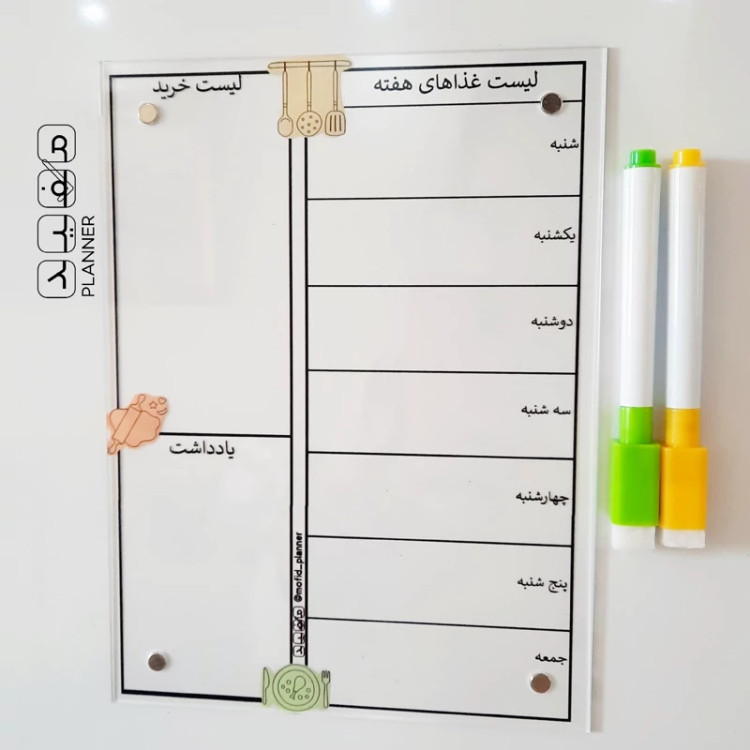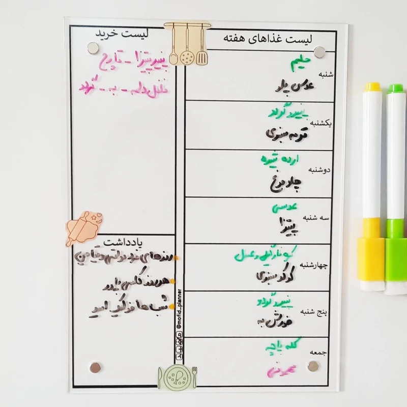 این همون محصولیه که شمارو از فکر هرروزه ی "غذا چی بپزم؟" راحت میکنه😉 🔰با این منوی اشپزی میتونین لیست غذای کل هفته و همینطور یادداشت ها و لیست خریدتون رو با ماژیک بنویسید و روی یخچال جلوی چشمتون نصب کنین. این محصول 4عدد مگنت ابکاری شده داره که محکم به یخچال میچسبه و هیچ اسیبی به یخچالتون وارد نمیکنه. سایزش 20*15 سانت هست و به همراه یه ماژیک مگنتی براتون ارسال میشه. از پلکسی 2میل ساخته شده و سبک و نشکن هست.