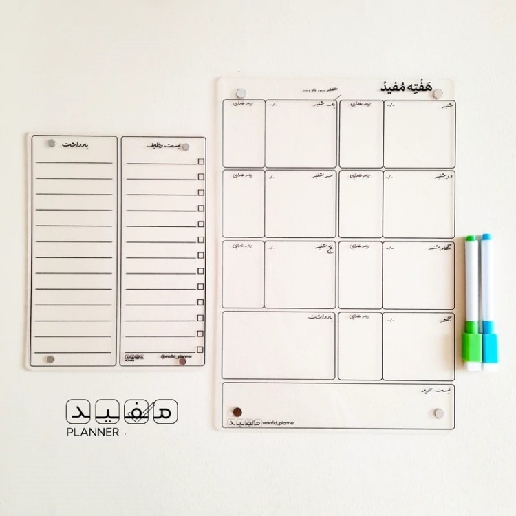مناسب برای برنامه ریزی هفتگی، روزانه و نوشتن لیست غذای کل هفته یک عدد پلنر شفاف مگنتی+یک عدد تودولیست شفاف مگنتی 🎀به همراه 1عدد ماژیک وایت برد پاکن دار هدیه سفارش شما🎀 جنس: پلکسی اکرلیک درجه یک ابعاد پلنر هفتگی: 30×20 ابعاد تودولیست: 20×15 ✅️مگنتها از بهترین نوع مگنت آبکاری شده هست و هیچ گونه خط و خش به یخچال وارد نمیکند.