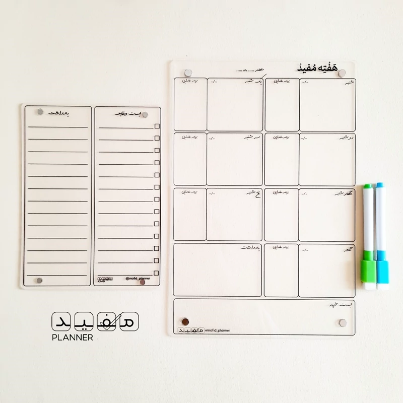 مناسب برای برنامه ریزی هفتگی، روزانه و نوشتن لیست غذای کل هفته یک عدد پلنر شفاف مگنتی+یک عدد تودولیست شفاف مگنتی 🎀به همراه 1عدد ماژیک وایت برد پاکن دار هدیه سفارش شما🎀 جنس: پلکسی اکرلیک درجه یک ابعاد پلنر هفتگی: 30×20 ابعاد تودولیست: 20×15 ✅️مگنتها از بهترین نوع مگنت آبکاری شده هست و هیچ گونه خط و خش به یخچال وارد نمیکند.