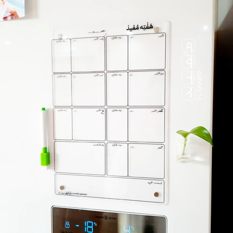 مناسب برای برنامه ریزی هفتگی و نوشتن لیست وعده های غذایی کل هفته 🎀به همراه 1عدد ماژیک وایت برد پاکن دار هدیه سفارش شما🎀 جنس: پلکسی اکرلیک درجه یک ابعاد پلنر : 30×20 ✅️مگنتها از بهترین نوع مگنت آبکاری شده هست و هیچ گونه خط و خش به یخچال وارد نمیکند.
